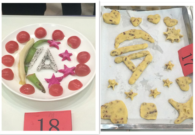比赛中,各组选手精心地准备着自己参赛作品,饼干造型各异,不到几分钟,一盘盘各式各样的水果拼盘就呈现在了大家眼前。
