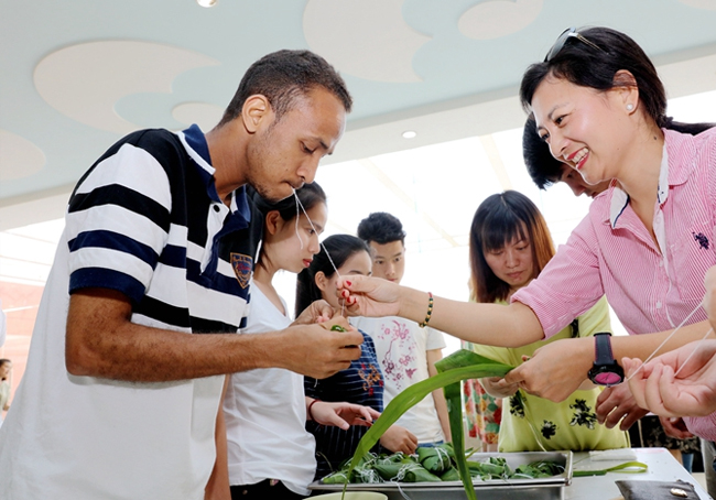 轻院留学生也到现场观摩比赛,并学习包粽子,共同感受中国的传统习俗。