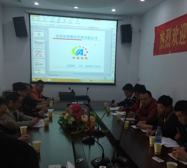 2016年11月5日,总部召开常州区域各项目厨师长会议,总经理对厨师长队伍作介绍,加深相互之间的印象,就公司简介、公司结构、企业文化、组织机构框架、业务介绍、公司目标、文化理念和共同目标等方面详细讲解,充分调动了各厨师长的积极性,为以后的后厨工作增添动力。副总经理对厨师长的发展情景做了详细分析,使在做的各位深刻的明白怎样做一个合格的厨师长,明确厨师长职责,强调食品安全的重要性,并且根据自己多年的从业经验,给各位厨师长分享了自己总结的厨师长应会的7种技能,以供大家鉴赏。