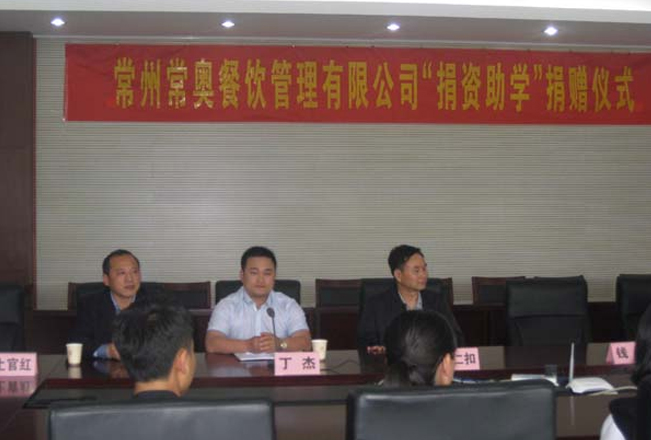 在捐资助学仪式上,丁总简要介绍了公司发展历程, 自2012年7月进驻常州旅游商贸高职校东食堂经营托管。为了回馈社会,支持常州教育,公司决定成立“常奥爱心基金”,每年拿出10000元人民币捐资助学。学校后勤处翟处长、许处长、学工处尹主任均对常奥餐饮的爱心捐助表示了感谢,同时对受助学生进行了鼓励