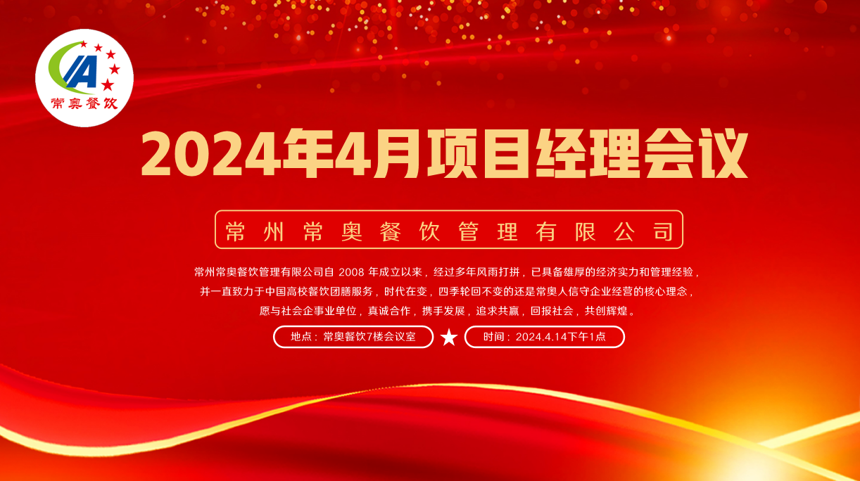 2024年4月14日下午13:00,常州常奥餐饮管理有限公司在常奥餐饮办公七楼会议室召开了2024年四月份经理总结会。公司总经理、副总经理,各项目管理人员及其公司各职能部门领导等20余人参加了此次会议。
