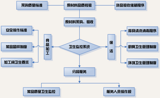 我公司建立健全各项管理制度,完善岗位职责,在安全控制和现场管理等关键流程上运用了ISO22000食品安全管理体系,坚持“预防为主”和“过程控制”的现场管理,采取自检、互检和专检三位一体的检验程序,从原料采购、入库检验开始,到存放、初加工、切配、烹制、主食加工、出售、剩餐处理的每道工序都制定了严格的标准,由质检员和卫生监督员实行全程跟踪检查,确保饮食卫生安全“零事故”。
